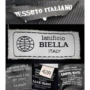 This dark navy blue blazer dates from the 1990s. Made 100% Italian virgin wool for Lanificio Biella. It is fully lined with two flap pockets, a chest pocket, and four additional pockets in the lining. Wear the pocket flaps out, or inside the pocket (as modeled).