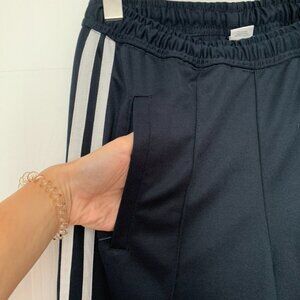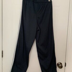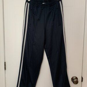 Vintage navy blue track pants with 2 white stripes on the side. Has pockets! The pants are straight cut with a front leg seam detail