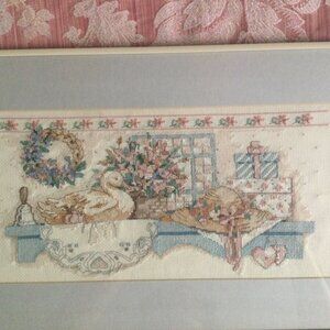 Vintage needlepoint swan flowers with Larson Juhl frame wall hanging home decor