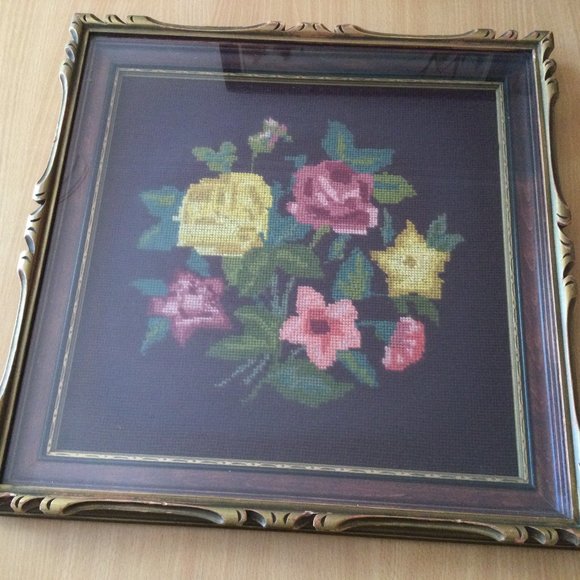 Vintage needlework yarn art embroidery with vintage solid wood frame flowers