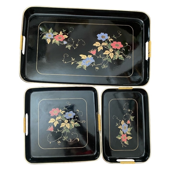 Vintage set of 3 nesting trays. Lacquered hard plastic with floral pattern. Handles are wrapped in plastic. Bottom is marked - Made in Japan. From the 1960s. Normal vintage wear with some scratches and wear on the finish. Look close and zoom on pics….