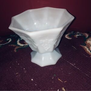 Vintage Octagonal Milk Glass Compote With Grape and Vine Pattern , very collectible.preloved,no chips or cracks. Check pics out might be anchor hocking