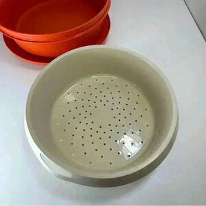 Vintage orange Tupperware seal n serve bowl 1337-15 with lid and strainer 1335-4. Check out this tangerine dream of a Tupperware container! From the 70s, this container is in excellent preowned condition with a very clean interior, no cracks or melts. There is one tiny gouge along the rim (pictured). The colander insert is a great addition to your collection as well; it only fits this particular bowl model and is in perfect condition.