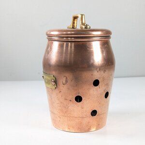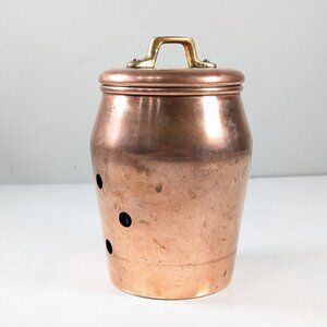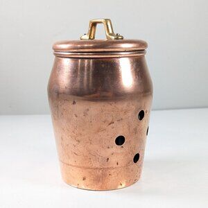 Delightful copper garlic keeper with brass detailing. Made in Korea. Vent holes to the sides and silver toned metal on the inside. Both the inside and outside with marks of age and use as pictured. Not perfect but perfectly rustic!