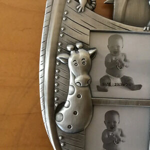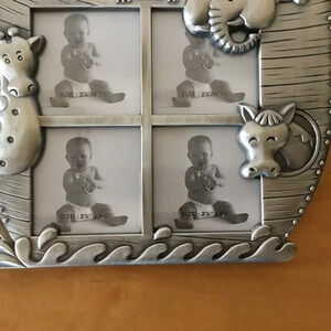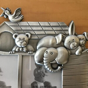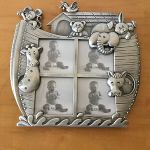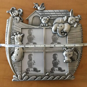 Vintage pewter children's photo frame with various animals (giraffe, horse, bear, elephant, rabbit, mouse, and bird) and four photo sections.