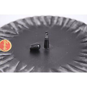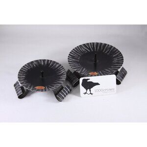 A set of 2 hand made metal pillar candle holders, from Western Germany (1949 - 1990). With a few small marks of age, with the original red "handarbeit" label to both, small marks of candlewax to the largest one. The smaller one still has the original rubber tip protector, which looks like it got stuck to the black finish on the tip.