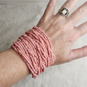 Multi strand lightly pearlecent rose pink dyed coral beaded bracelet with brown crochet band and coconut shell button closure.