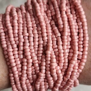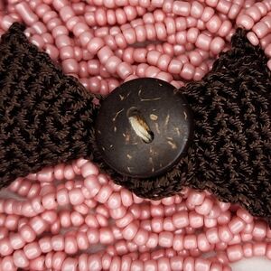 Multi strand lightly pearlecent rose pink dyed coral beaded bracelet with brown crochet band and coconut shell button closure.