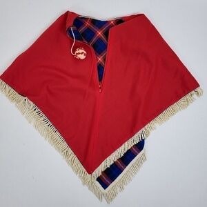 Vintage plaid poncho jacket cape fringe tassels lined warm winter zip-up
