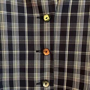 Beautiful vintage wool blazer, made in Germany. Black and white plaid with yellow, a solid black collar and multicoloured buttons. No size tags but best fits a medium,