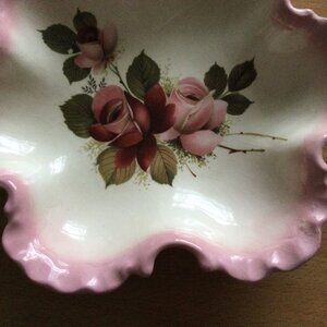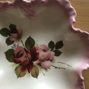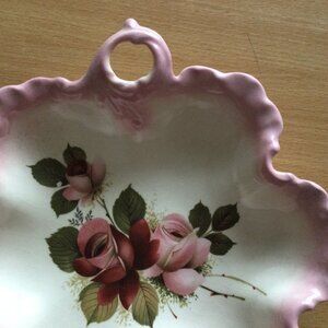 It is a beautiful decorative plate/bowl/dish decorated with pink and red roses and green leaves. It has a scalloped edge and a finger-grip handle.