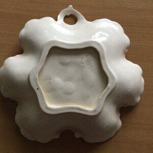 Vintage plate/bowl pink scalloped edge roses leaves finger handle signed L B 8"