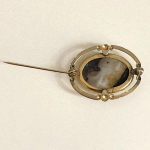 A pretty marbled stone in a gold washed silver frame, measuring 1-1/4 X 1 inch. I think it displays well both vertically and horizontally (the direction of the pin). In very good shape, no markings. (d)