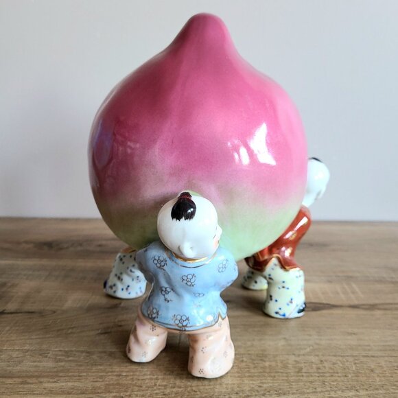 Vintage porcelain figurine. 3 Asian boys lifting Longevity Peach. 10.5'' tall.