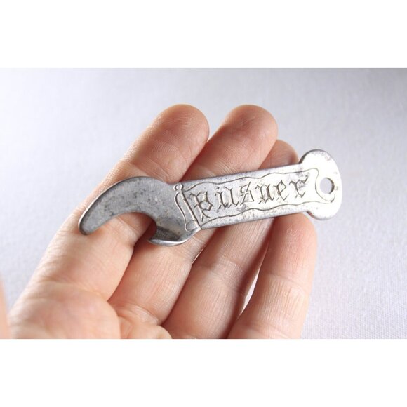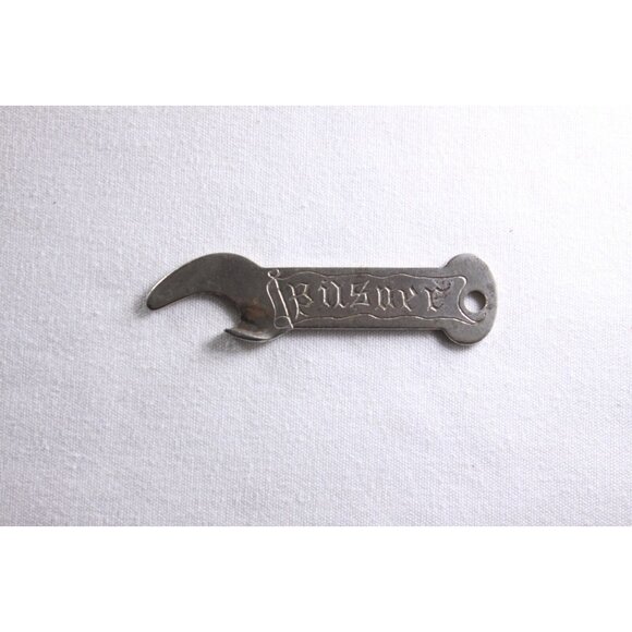 A nice old beer or soda bottle opener, marked PILSNER on the one side "Nut Brown Ale Royal Stout" on the other. The bottom hook is twisted and the tip rounded so not sharp and easier to use. Perfect to hang on a keyring.