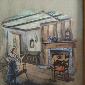 Vintage print "The wool spinner" Paul Parker solid wood frame small wall decor.