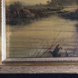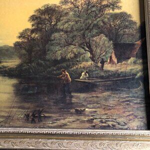 Vintage print of a man fishing in a serene pond surrounded by lush trees and a distant boat, creating a tranquil landscape scene. This framed wall decor piece adds a touch of rustic charm to any home decor.