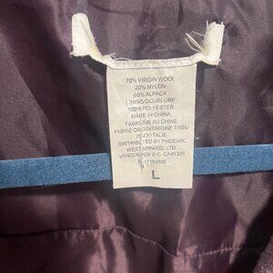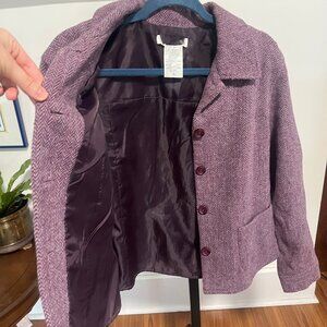 Cute purple tweed blazer. Wool, alpaca, nylon exterior. Fully lined and intact. The lining is not full sewn in at the hem, so there is a potential to tailor.
