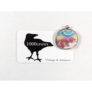 A lovely thick and older ceramic piece, featuring various rainbow colours, remade into a large pendant. The surrounding edge is unmarked but looks like a silver plate. In good shape with some wear to the silver finish on the edge and the ceramic piece has a *touch* of movement inside the surround - it will need addition of a chain (not included).