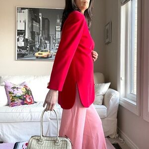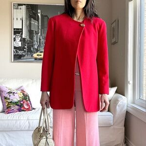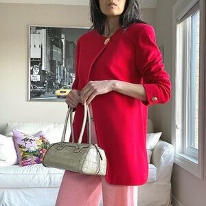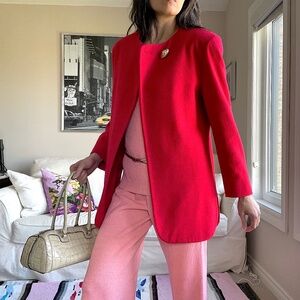Inner button with outer crossover button closure. Gold toned buttons at collar and decorative buttons at cuff. Fully lined. Shoulder pads. Side slits at hem. Made by Mr.Jax. Labelled size 4.(see measurements). Model is size small, 5’9. 50%wool/20%cashmere/30%nylon. Approx 30%length, 17in shoulder seam to seam, 21.5in shoulder seam to cuff, 19.5in pit to pit, 18.5in width at waist area. Some balding of wool in upper chest area(see last pic)