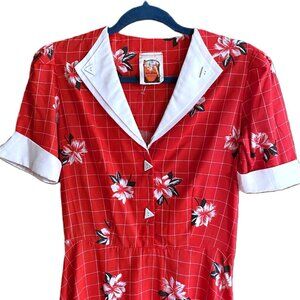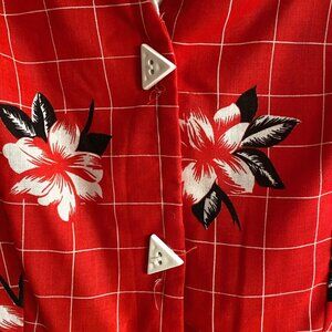 Vibrant red with a grid pattern in white and a floral pattern in black and white