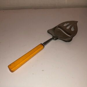 Charming vintage cheese slicer with a vibrant yellow handle. Perfect for adding a retro touch to your kitchen.