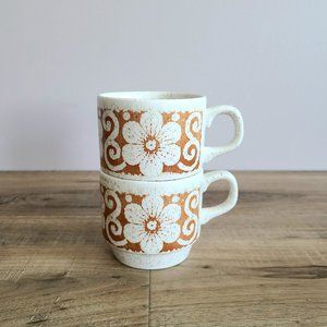 Vintage set of 2 Biltons stackable speckled mugs with light brown floral design.