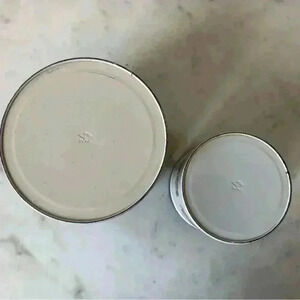 This retro set of two nesting tins with lids has a pattern similar to Spice ‘o Life in the earthy tones that were so popular in the 70s. They have the typical rusting and tarnish that vintage tins tend to have. There is some paint chipping (and small specs of white paint on the lids that I didn’t want to attempt to remove). The graphics are still sharp and unfaded, great for a shabby chic display.