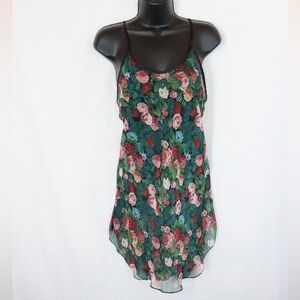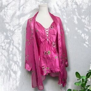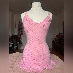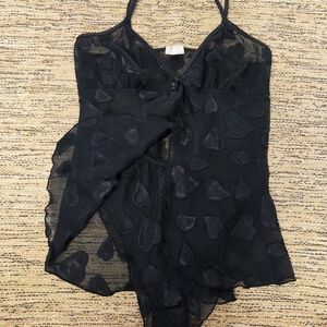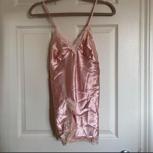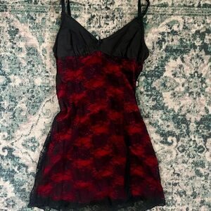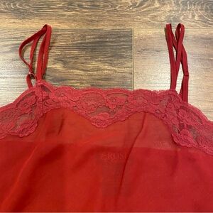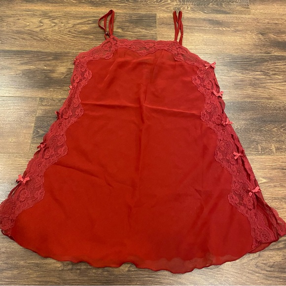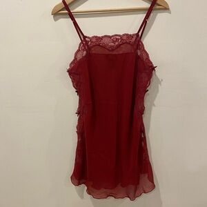 Gorgeous vintage nightie in a size small. Burgundy coloured sheer material with lace and bow details. Pretty lettuce hemline with adjustable straps.