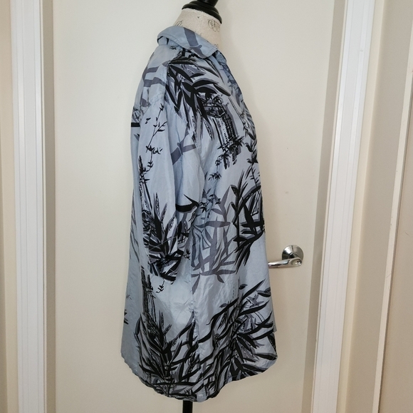 Black, grey & silvery blue Hawaiian print short sleeve casual buttondown shirt with matching blue buttons and left chest pocket, by Premiere Collection.
