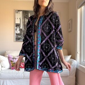 Fully lined. Hook and eye front closure from neck to hem. Made by Michel Antoni. 100%silk. Lining 100%polyester. Labelled size 3X(see measurements). But may fit up to Large. Model is size small, 5’9. Approx 29in length, 18in shoulder seam to seam, 24.5in shoulder seam to cuff, 25in pit to pit, straight cut.