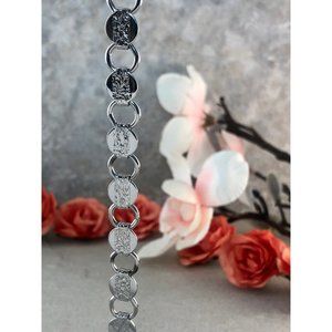 Vintage Sarah Coventry Silver Tone Disc and link chain bracelet. The bracelet is 7" in length and 3/8" in width with a fold over clasp. You can add charms to the open links . In excellent condition. The discs are stamped with a floral design and it is marked SARAH COV. Wee