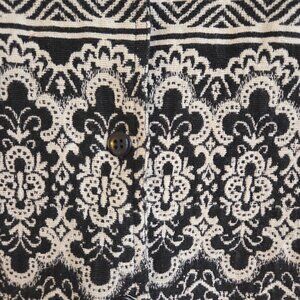 Made from a fabric featuring an intricate black and white woven pattern. The design is highly ornamental, almost baroque or Victorian inspired, with repeating floral and scroll motif.