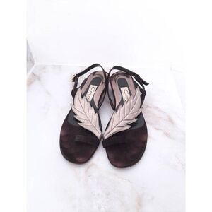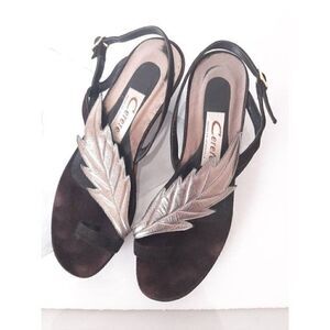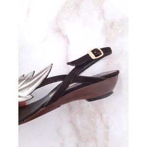 Vintage sling back sandals with leather leaf and buckle silver and black sz - 6