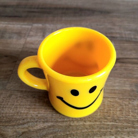 Vintage smiley face hand plastic yellow mug.