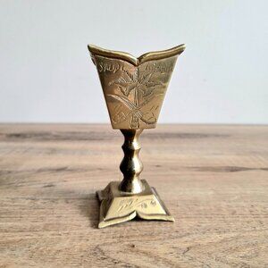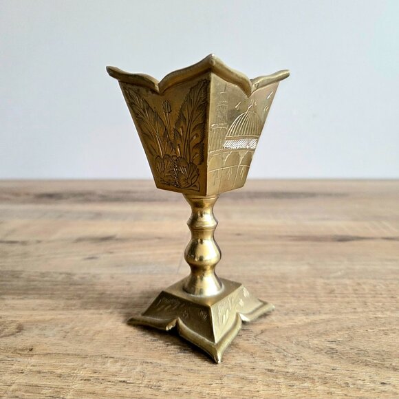 Vintage solid brass candleholder with etched design. Saudi Arabia.