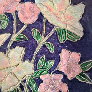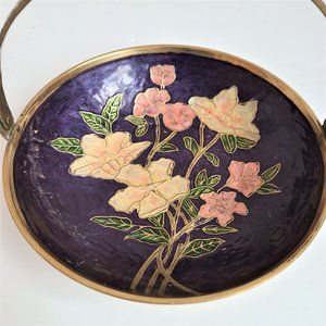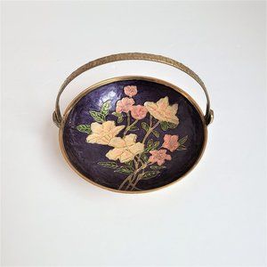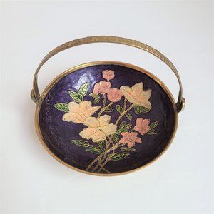 Very pretty vintage solid brass inlay trinket or candy dish with handle. 5 1/4'' wide. Good vintage condition.
