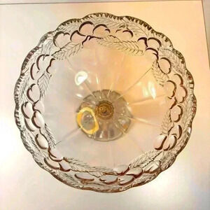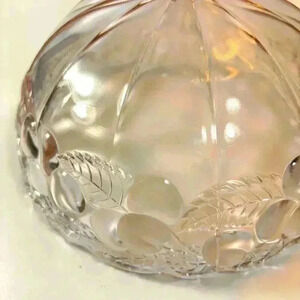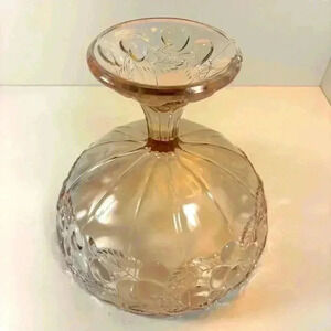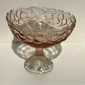 Vintage stamped glass large pink cherry design pedestal bowl. (This is manufactured in the depression glass style, but it is more modern.) Cherries and leaves wreath around the scalloped top and base. 7.5" Tall 9" Top Diameter on a 4 1/8" Round Base. Excellent preowned condition. No chips or cracks. Heavy and beautifully made.