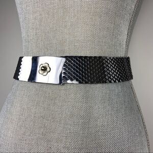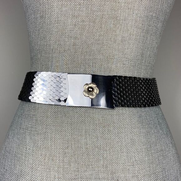 Vintage silver and gold tone serpent stretch belt. Shiny floral detail to buckle good vintage condition light scratching to metal. Pictured on size 5/6 mannequin