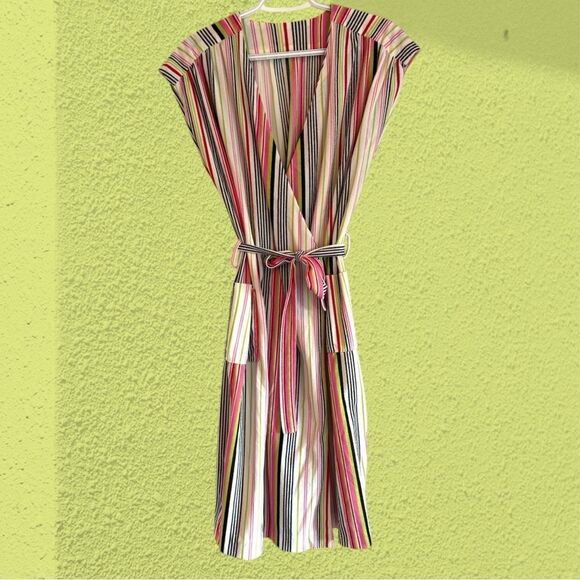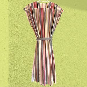Adorable vintage swim cover/ robe. Short sleeve style with snap clasp closer and waist tie, large pockets, pink, green, black and white stripes on thin terry cloth.