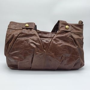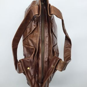 Vintage style brown leather pleated, top zipper closure large strap tote handbag