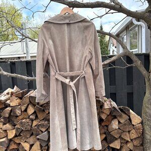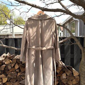 Vintage suede wrap coat in taupe. Suede belt tie. In great shape, missing one button but hidden under the lapel and not noticeable, especially if you don’t plan on buttoning up and just using the tie. Satin liner in great shape, with zippers for an extra liner that unfortunately didn’t come with the coat when I purchased. Heavy suede, hangs beautifully.