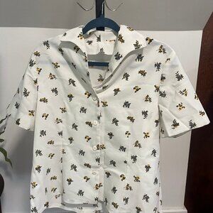 Handmade white and yellow floral button-up shirt. Cropped length with darts in the back. Buttons say Kensington express