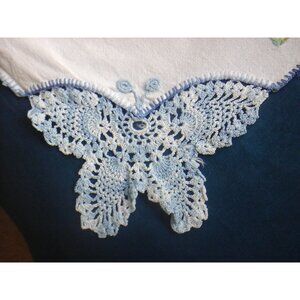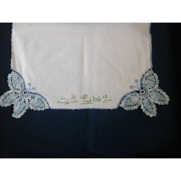 Vintage table runner dresser scarf with blue crocheted butterflies 34" x 15"