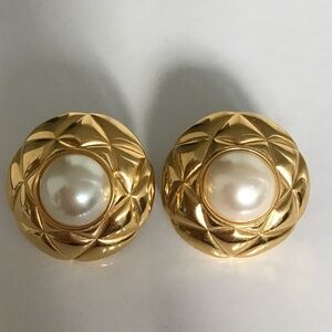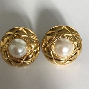 Beautiful vintage gold tone textured round clip on earrings with ivory tone faux pearl