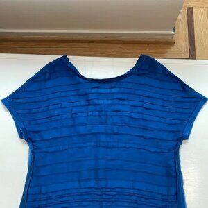 This is a beautiful top. Sheer silk in a rich blue colour. Lovely detail with raw edges. The size tag has been cut out, so please see measurements below. My guess is about a medium.
