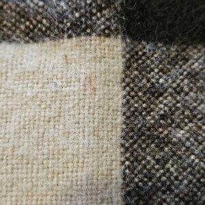 Vintage, traditional, woven wool blanket with a fringe, throw, warm cover/wrap/shawl, picnic blanket, with stripes, large checks, plaid style patterns, made for Eaton in Uruguay. Picnic blanket, beach blanket. Ideal cover up, wrap or throw blanket for cooler weather, evenings, inside or outside. Size width 51(25.5x2) inches, length 62 inches, fringe not included. Colour cream, fawn, browns. Material 100% wool, little used, hardly worn, well cared for 1 spot mark that could be spot washed out. Season all year, spring, fall, winter. Washing info. dry clean. (Twin mattresses size 38 x 75 inches.)