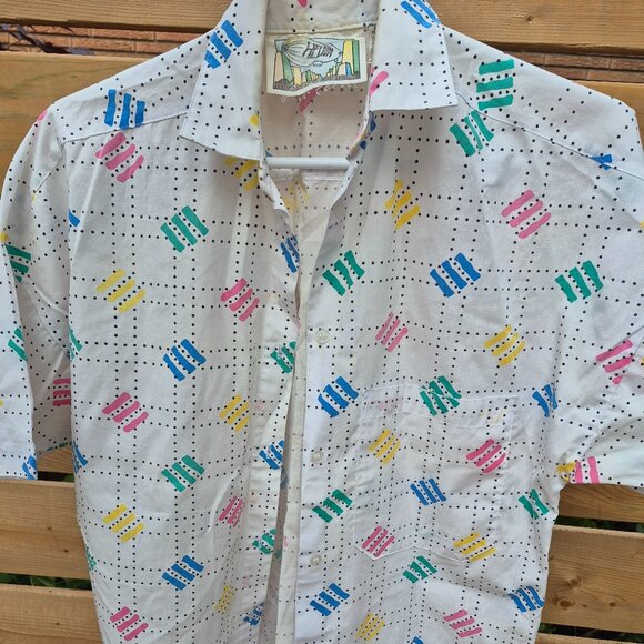 Very retro 80s button down shirt (short sleeved) with turquoise, blue, yellow and pink and black dots.