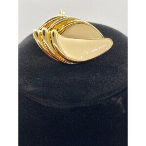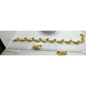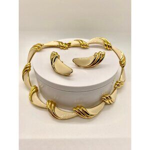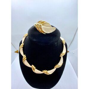Vintage unsigned beautiful jewelry set of gold white necklace + clip on earrings