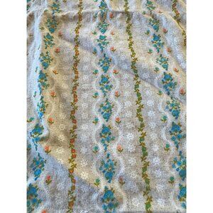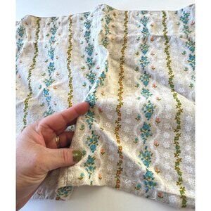 Vintage valance curtain, ecru, blue pink white flowers, short panel, rod heading